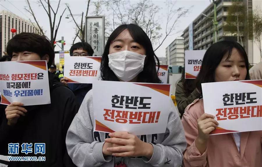 4月13日,在位于韩国首尔的美国驻韩国大使馆附近,韩国民众手举反战标语参加集会,反对美国“卡尔·文森”航母战斗群驶向朝鲜半岛附近水域,加剧朝鲜半岛紧张局势。图|新华社