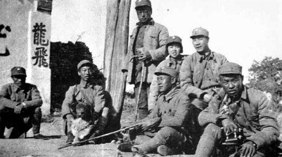 图注:1940年,一分区主要干部在狼牙山棋盘坨指挥所前合影。左起:黄连秋、史前进、高鹏、赵志珍、杨成武、曹凌、赵凡。