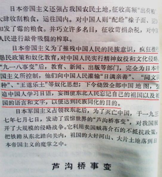 据资料提供者说,他所展示的这几本书有1958年出版的,有1971年出版的。目前该资料的具体年份来源较难查证,但通过其中所采用的字体和一些话语如“毛主席的英明领导”“美帝国主义”“日本帝国主义”“日本法西斯强盗”来看,年份在新中国前三十年期间是无疑的。1958年,恰好是大跃进如火如荼的年份,1971年也是处于文革时期。这两个时期是被视为不正常的年代、“疯狂的年代”的,然而,即使是在此期间,我国对日本军国主义在我国所犯的包括“南京大屠杀”在内的滔天罪行也没有丝毫的隐瞒,并且对日本军国主义的揭露恐怕比现在的一些说法还要深刻得多、细致得多。大家可以搜一下1970年7月14日《光明日报》的一篇文章《评日本反动影片《啊,海军》》,我在这里仅展示该文中的两段: