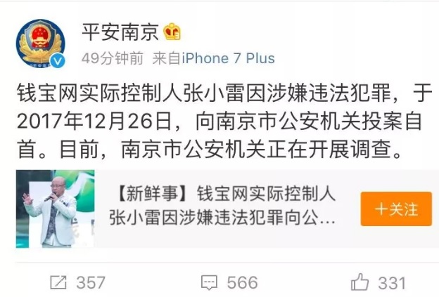 周三午间,平安南京发布微博称,钱宝网实际控制人张小雷因涉嫌违法犯罪,于2017年12月26日,向南京公安机关投案自首,目前南京市公安机[详细]