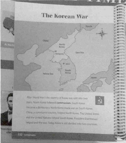 关于朝鲜战争,叙述围绕“共产主义”与“民主”展开:二战以后,朝鲜分成两部分。北朝鲜实行共产主义,南朝鲜实行民主。北朝鲜向南朝鲜发动战争。共产主义的中国帮助北朝鲜。美国和联合国帮助南朝鲜。艾森豪威尔总统帮助结束了战争。今天,朝鲜仍旧分为两个国家。