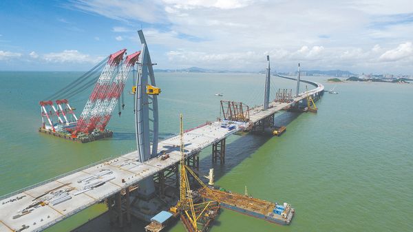 港珠澳大桥将把粤港澳大湾区各地更好地连接在一起。图为建设中的港珠澳大桥。